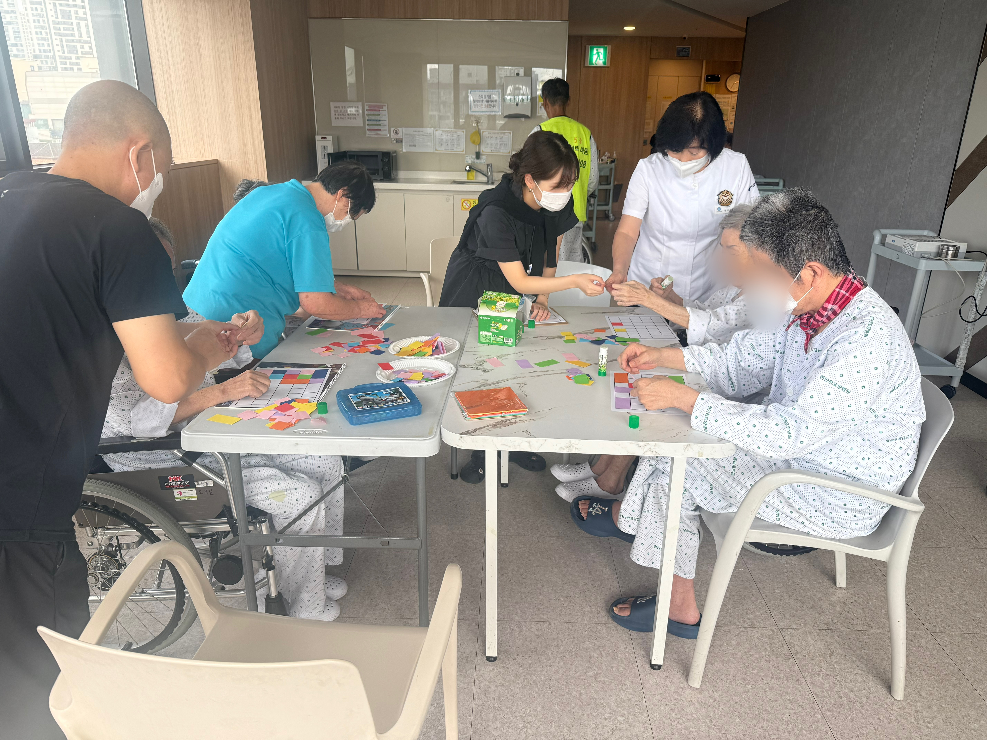 편안한 요양병원 사회복지프로그램 - 몬드리안 색종이 붙이기