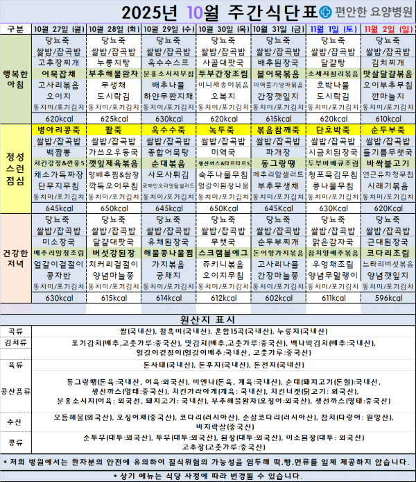 2025.10.27.(월)~2025.11.2.(일) 주간식단표