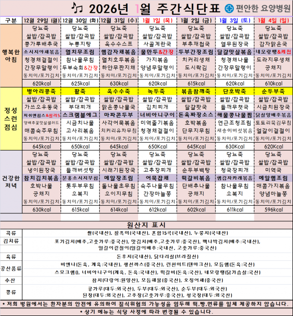 2025.12.29.(월)~2026.1.4.(일) 주간식단표