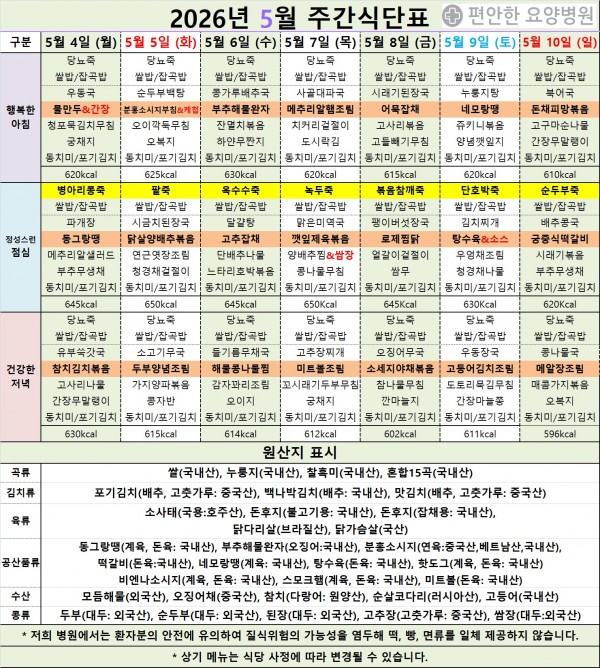 2026년 5월 첫째 주 식단표 입니다.