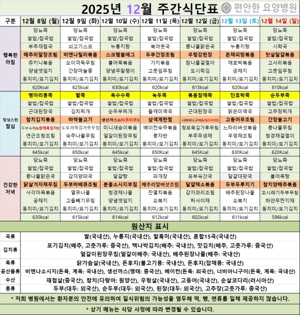 2025.12.8.(월)~2025.12.14.(일) 주간식단표