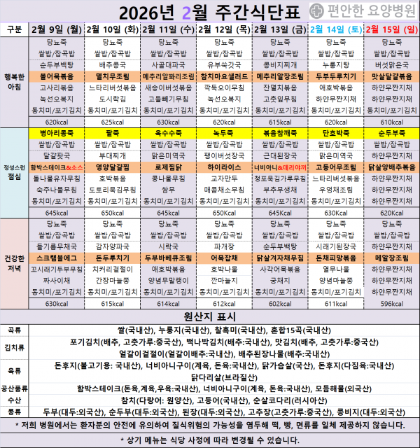 2026.2.9.(월)~2026.2.15.(일) 주간식단표
