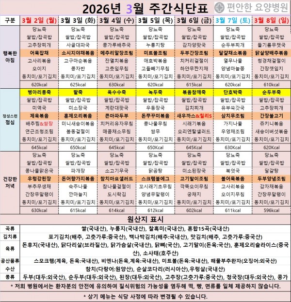 2026년 3월 첫째 주 식단표 입니다.