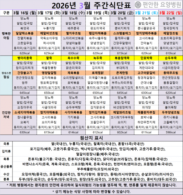 2026.3.16.(월)~2026.3.22.(일) 주간식단표